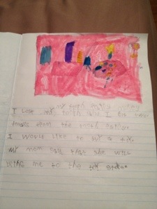Here is a journal entry Abby made about the tooth fairy coming to the house.