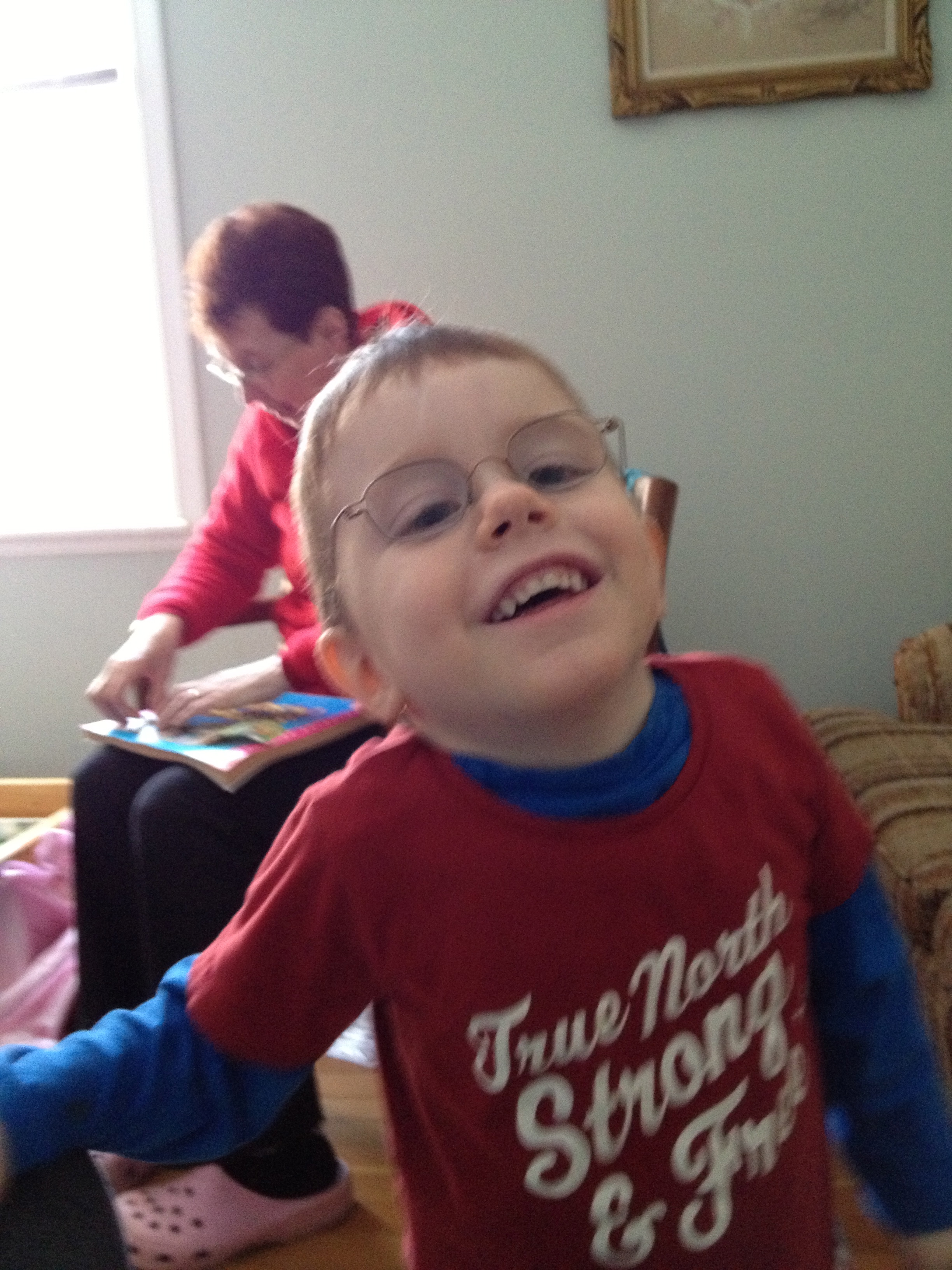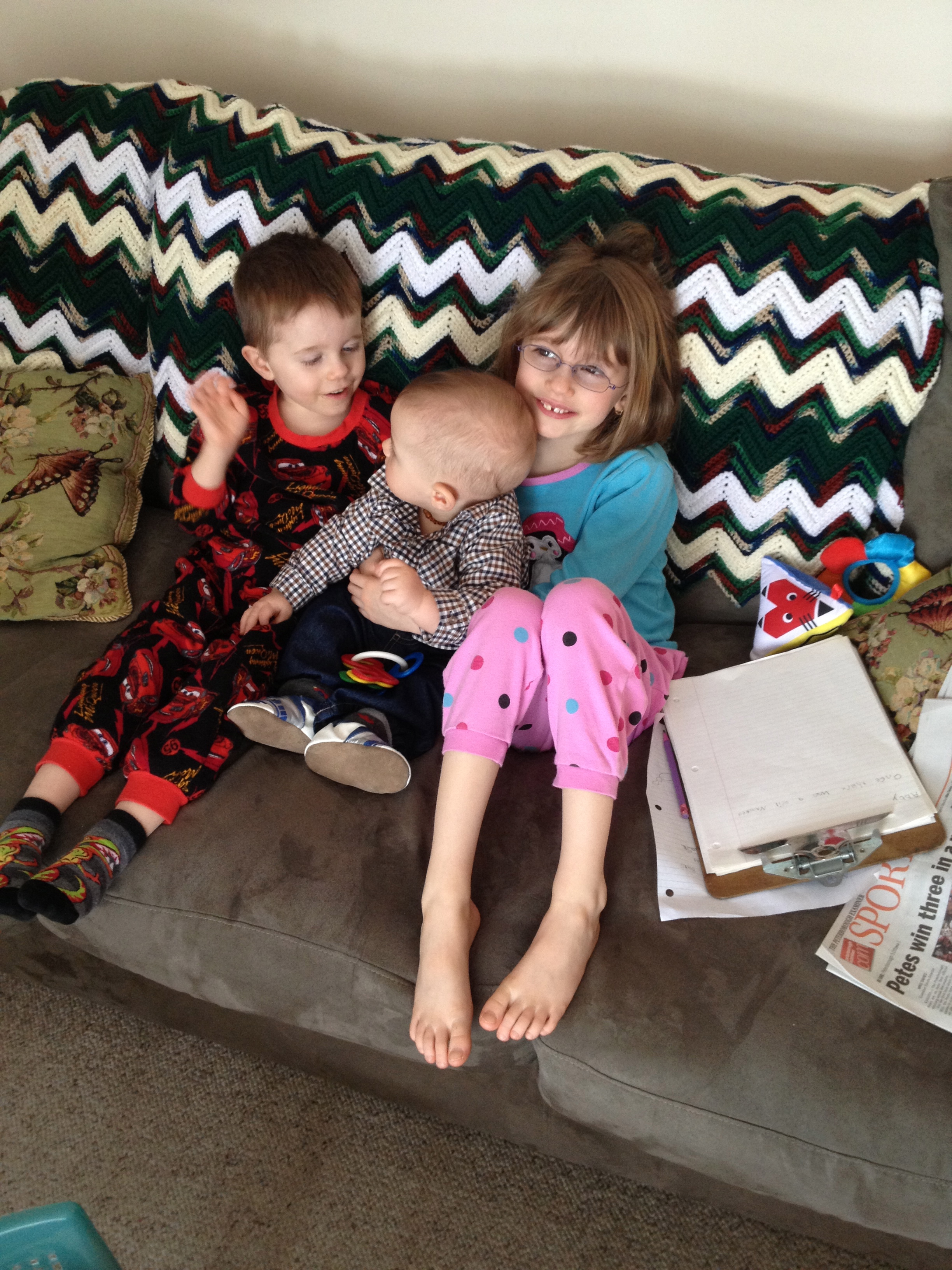 On Family Day Weekend, I went to Mom & Dad’s for the weekend. It was a very relaxing weekend. On Saturday morning, Julie came over with Macklan and visited for a little while. The kids helped to feed Macklan some breakfast and then snuggled with him on the couch, which made for some cute pictures.