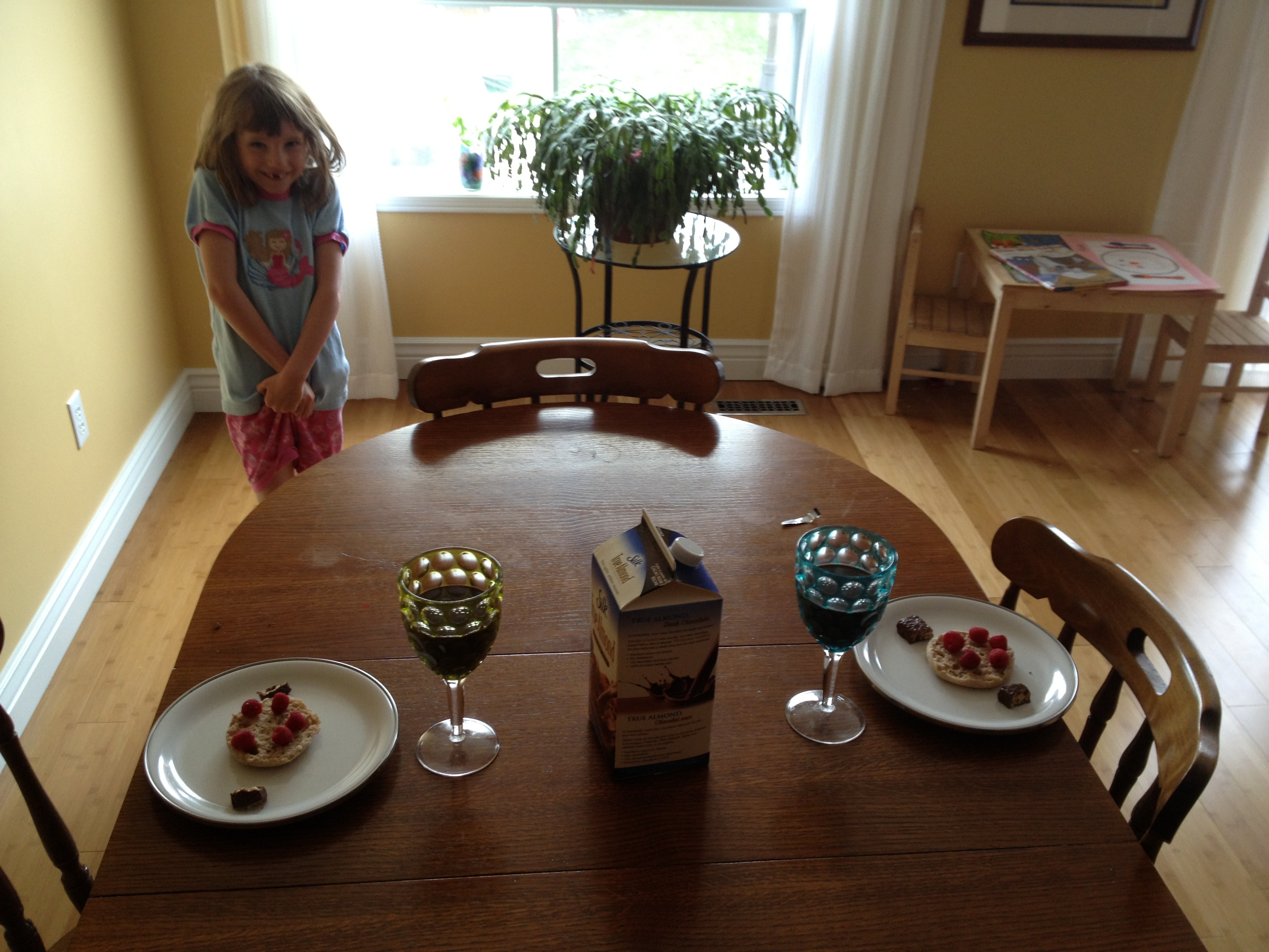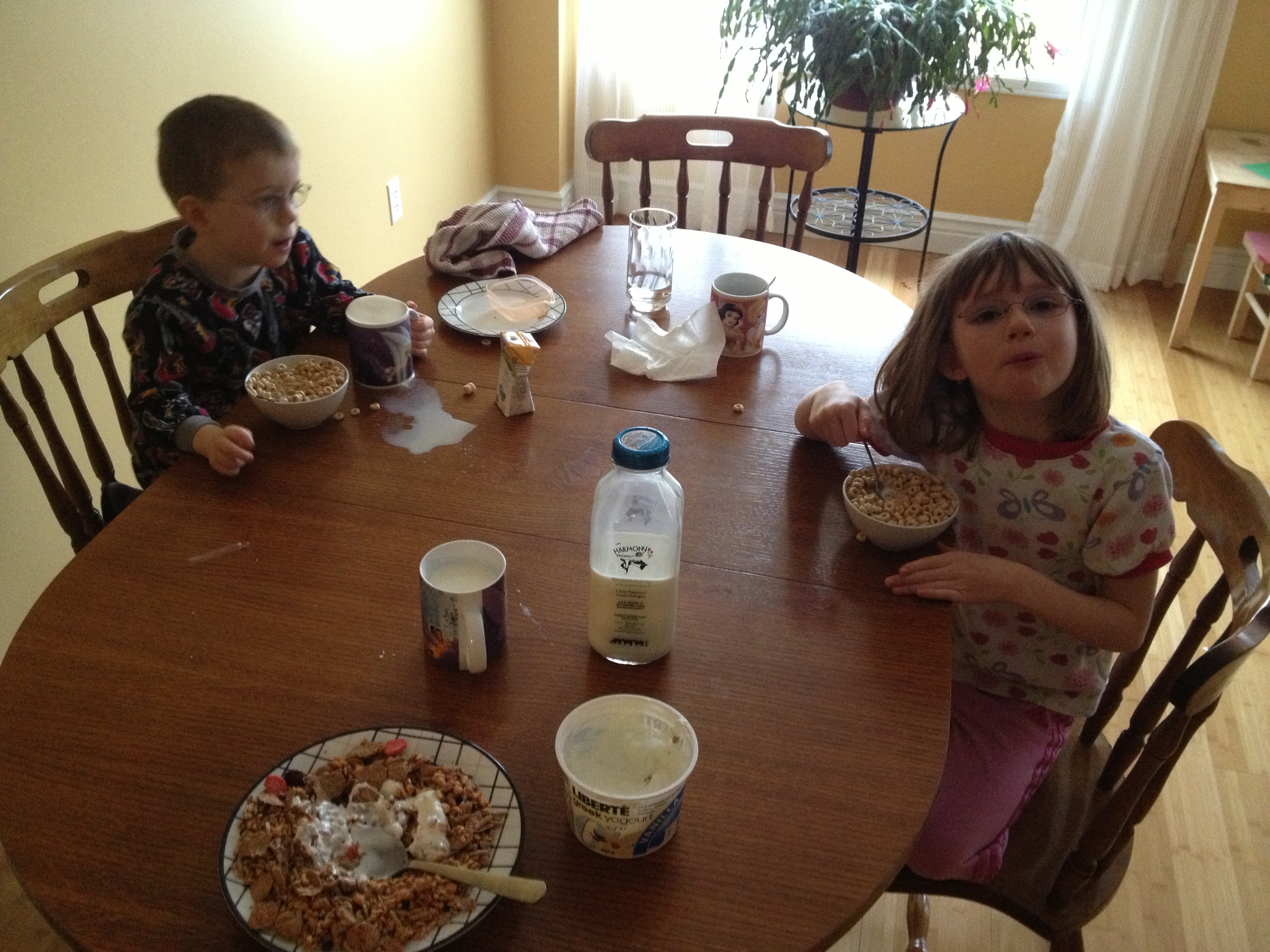 On the weekends, the kids often get downstairs ahead of me in the morning. Usually, Abby gets a yogurt out of the fridge for both her and her brother to snack on until Melissa or myself come down to make them breakfast. However, on some mornings the kids decide to help out and make breakfast for us instead. Below are a couple of their breakfast creations 🙂