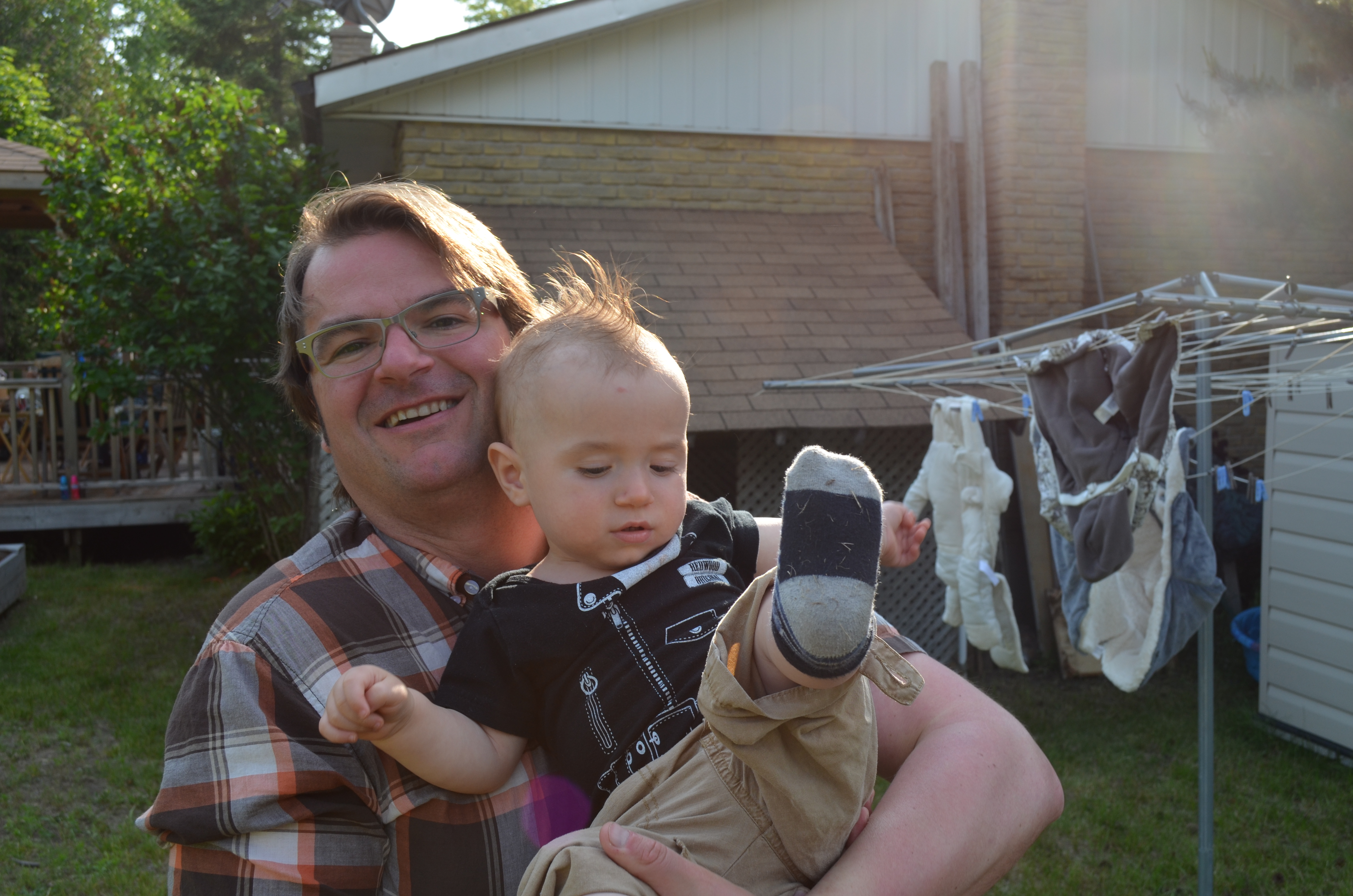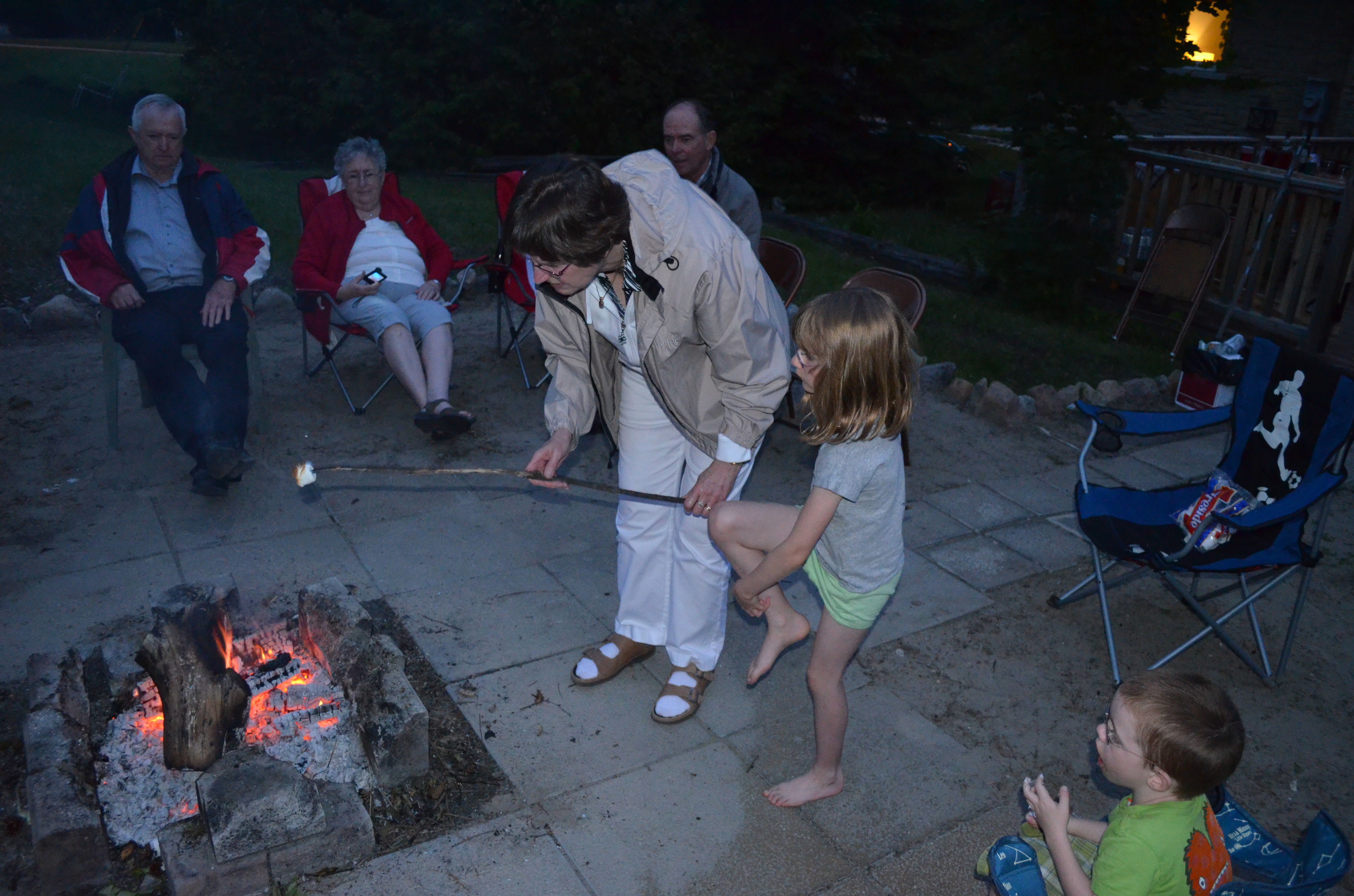 For the party, Peter & I cooked some Hamburgers & Hot Dogs and had a wide assortment of salads and desserts inside for people to choose from. During the party Abby & Aiden played with their cousin Morgan who is in grade 9, including a short trip to the park. When it got a little darker, Peter started a bonfire and the kids roasted marshmallows with the help of Jane and myself. Abby was so tired by the end of the night that after going to the washroom around 9, she went to bed all by herself without telling anyone. When I went looking for her in the bathroom, I found her on top of the covers facing the wrong way in the bed half asleep. I helped her put on her PJs and tucked her into bed. The next morning, Abby slept in to almost 8 and Aiden slept in until 9, which ever happens.