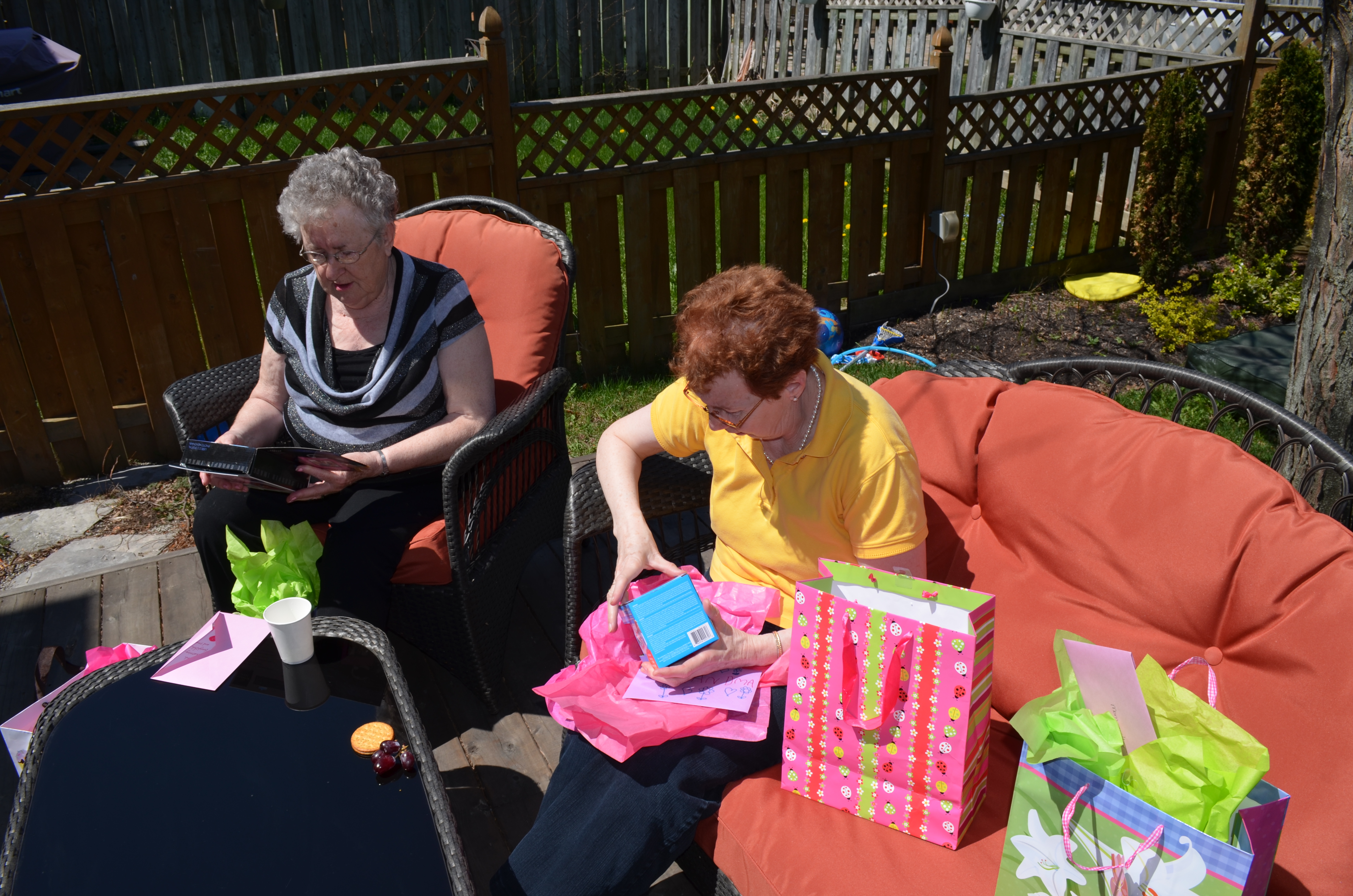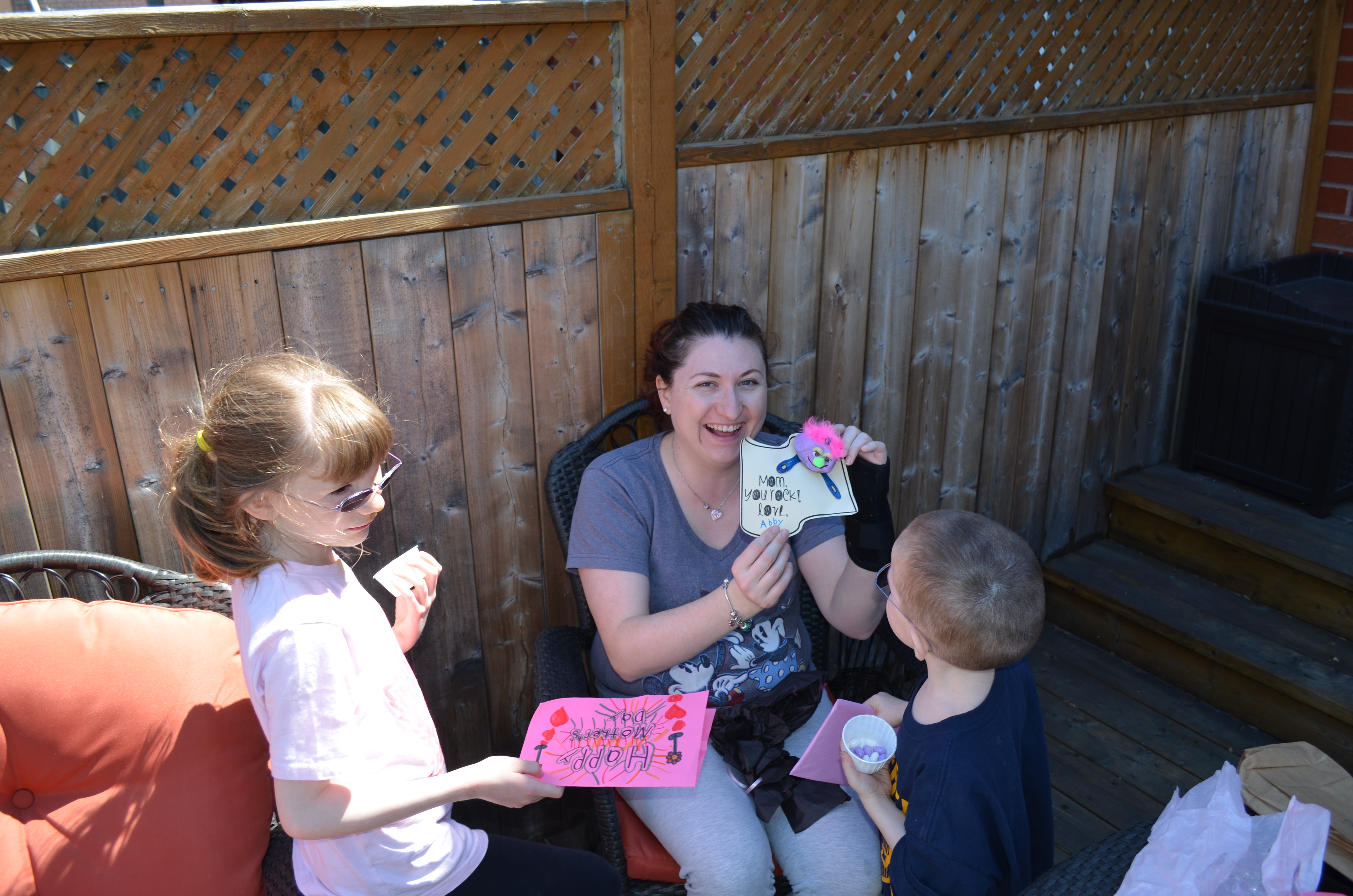When we came home fro the park, all the Mother’s opened up their gifts. This year Abby and Aiden had painted mugs for all of the mother’s and grandmother’s. The kids also gave Mom gifts that they had made her in school. I gave Melissa a Pandora Charm inside a garbage can which was also part of her gift. The garbage can was for her to put beside her bed so that she would stop taking the one out of the bathroom.