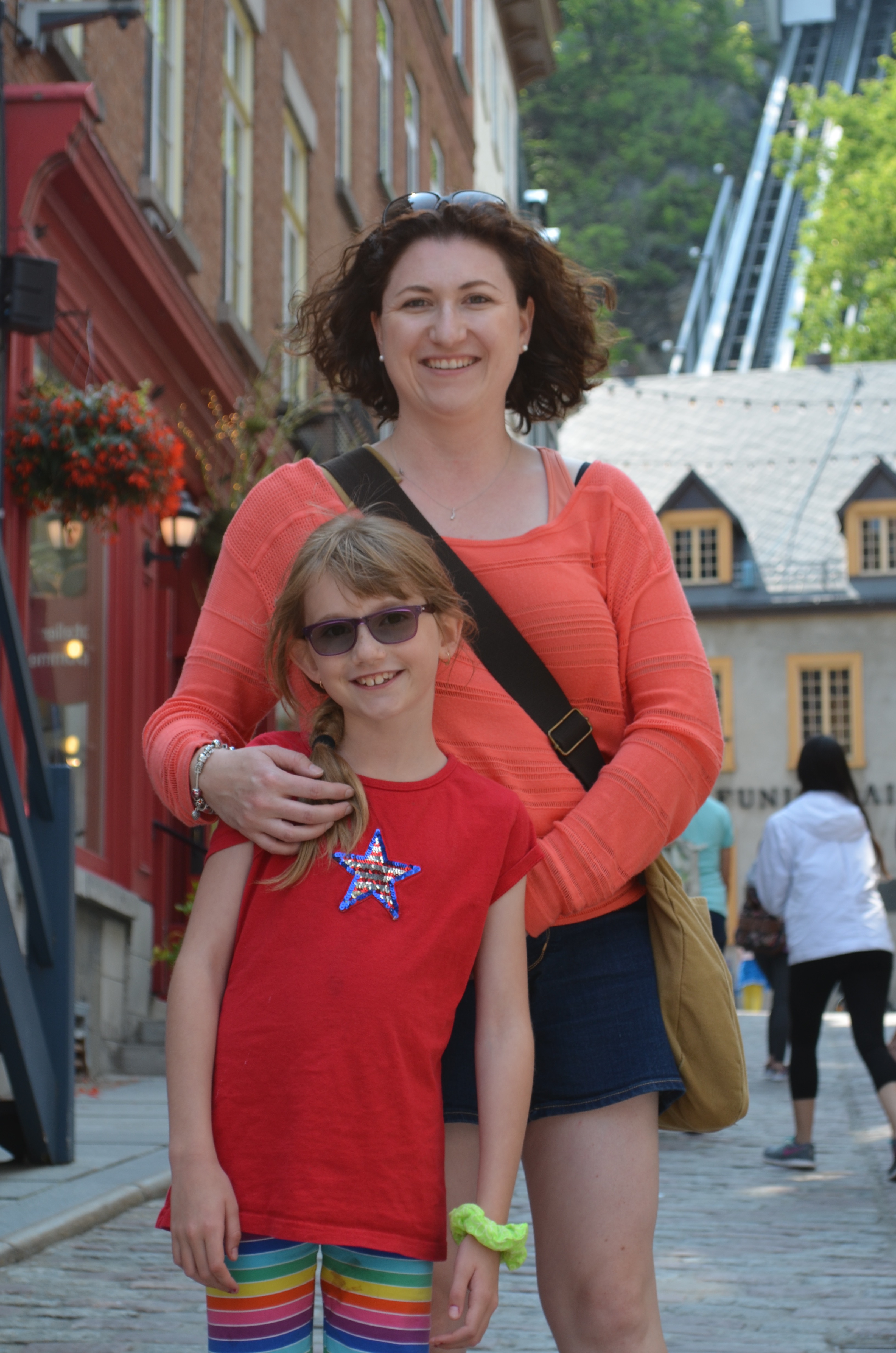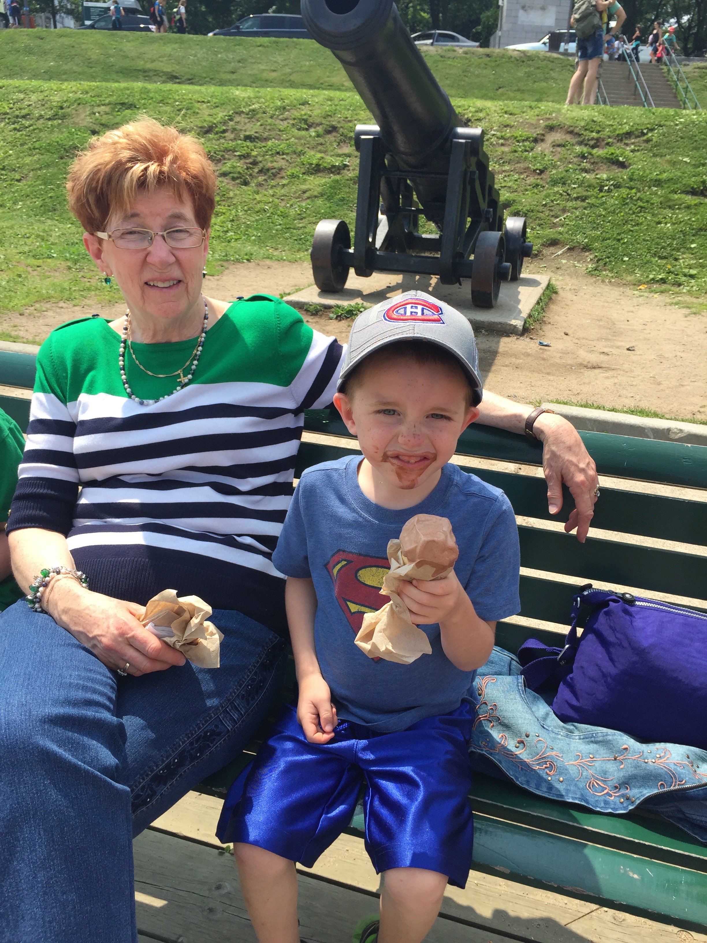 When we were there, we saw them setting up for the Summer Festival that is hosted on the Plains of Abraham for 2 weeks. We then walked down the boardwalk towards Old Quebec. When we got to the end of the Boardwalk. the kids posed for some pictures on some canons and then they all got some ice cream courtesy of Auntie Cathy. They then ate in the shadow of the Chateau Frontenac. At this point, Martin and Holly left to go and pick up Jasper from daycare and Cathy, Melissa, the kids and I carried on touring Old Quebec.