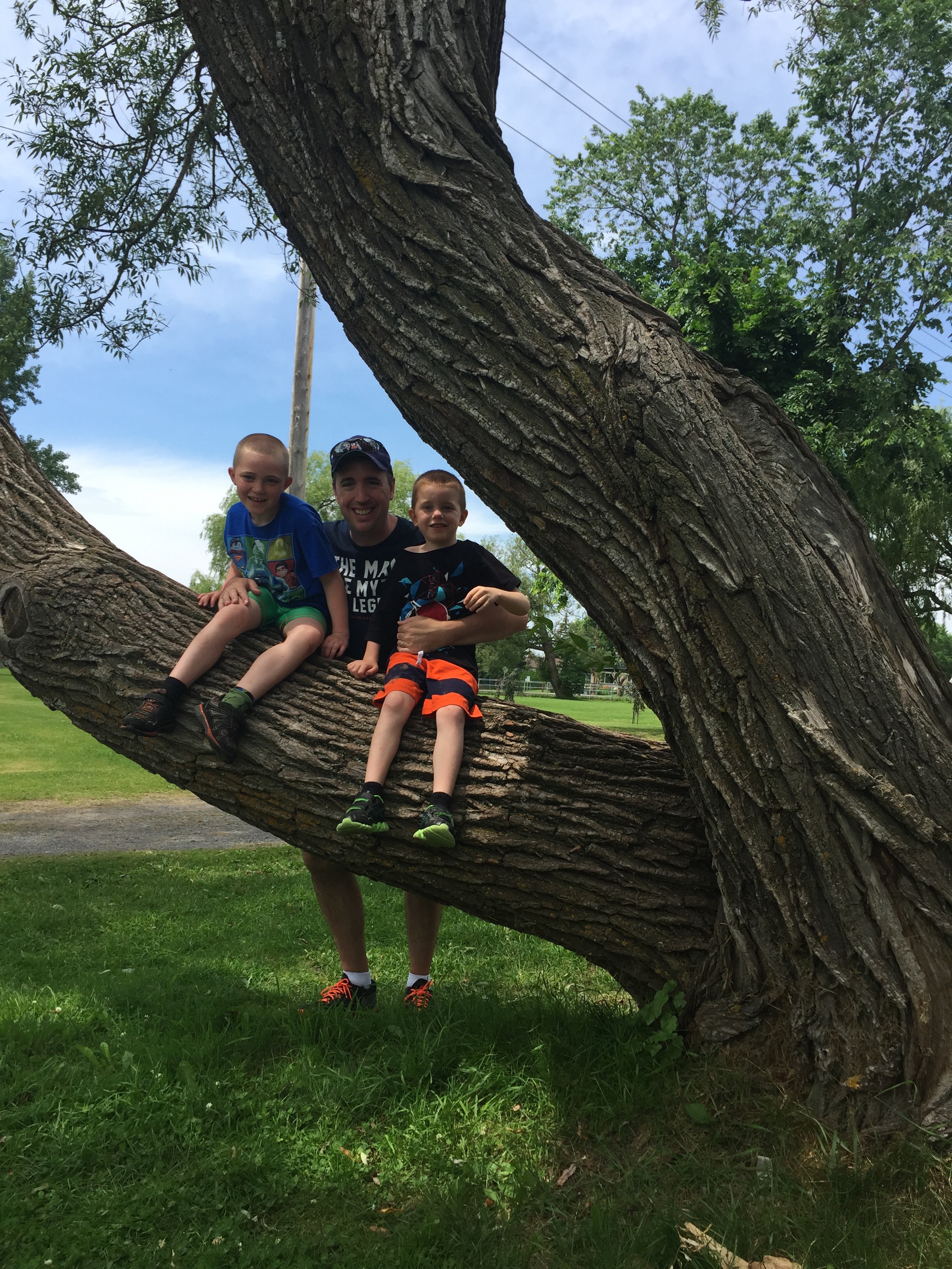 After we finished at St. Anne de Beaupre, we headed to Montmorency Falls. Instead of climbing the stairs at the Falls, we decided, since the kids were tired, to go the Hotel at the top of the falls to see the view. When we got there we had a lovely picnic that Cathy had packed for us and the kids. Uncle Jack had even cut the crusts off the sandwiches for them 🙂 This confused Aiden a little because he was not sure where to hold the sandwich and where to eat the sandwich. Once we broke it into a couple pieces he ate most of it up. During the picnic the kids enjoyed climbing some of the trees on the Hotel grounds.